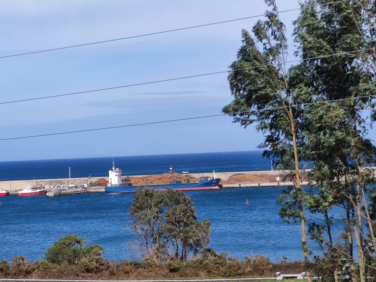 This is a ship at Burela port which is being stacked with eucalyptus logs. Here are the stacks of logs. These are actually very big piles, however it’s not clear in the photo. There’s a crane towards the right of…