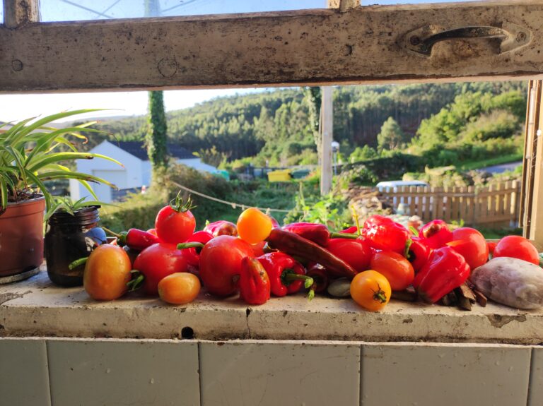 Here’s a photo of some of our tomatoes and peppers which are still coming through well. After a very slow and disappointing start, we’ve had not too bad a harvest. We had a few different types, including some yellow cherry…