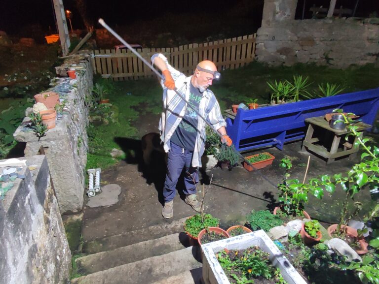 and holding a drain rod? Well – having rediscovered Daisy’s luminous ball and enjoyed a couple of mins playing outside, her ball went down a little drainage tunnel under the front of the house and got stuck. And there is…