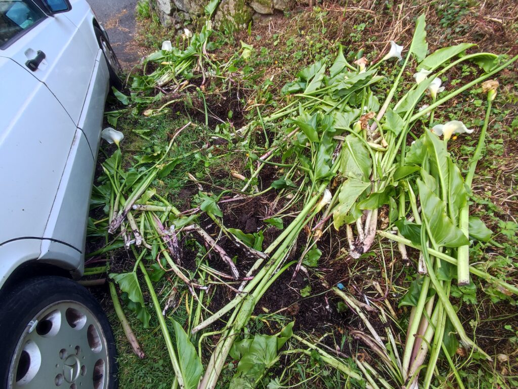 I thought Ian had mysteriously hacked down a clump of lilies by the car – but couldn’t think why he would have done it overnight. When I asked him, he looked at me oddly, obviously wondering why I would think he was a night time lily chopper. We mused over the pile of fallen lilies for quite a while as it had been done with such energy. Bits of lilies were scattered all over the place.