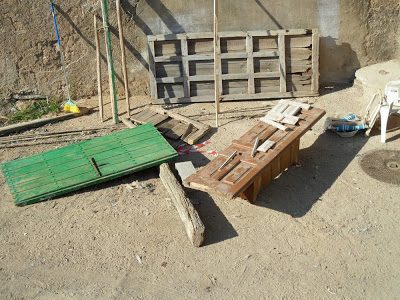 The green door will be a table for the outdoor kitchen. The brown table is being cut down to make legs.