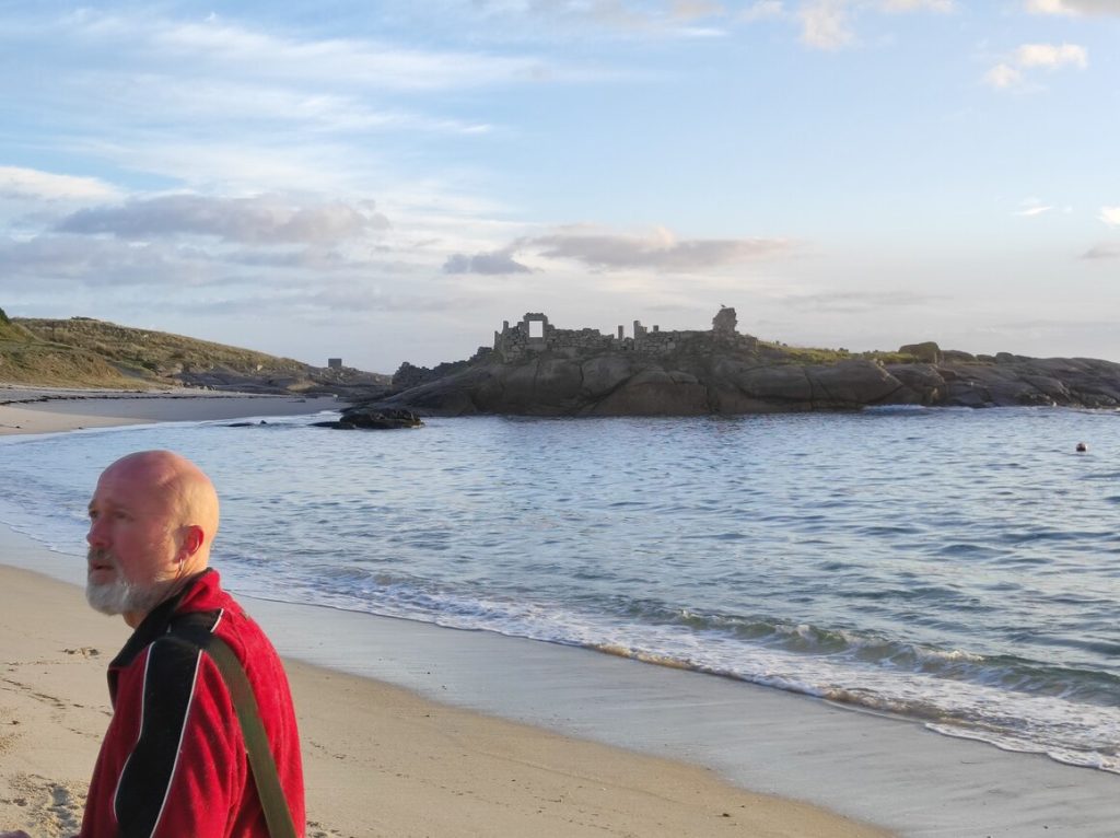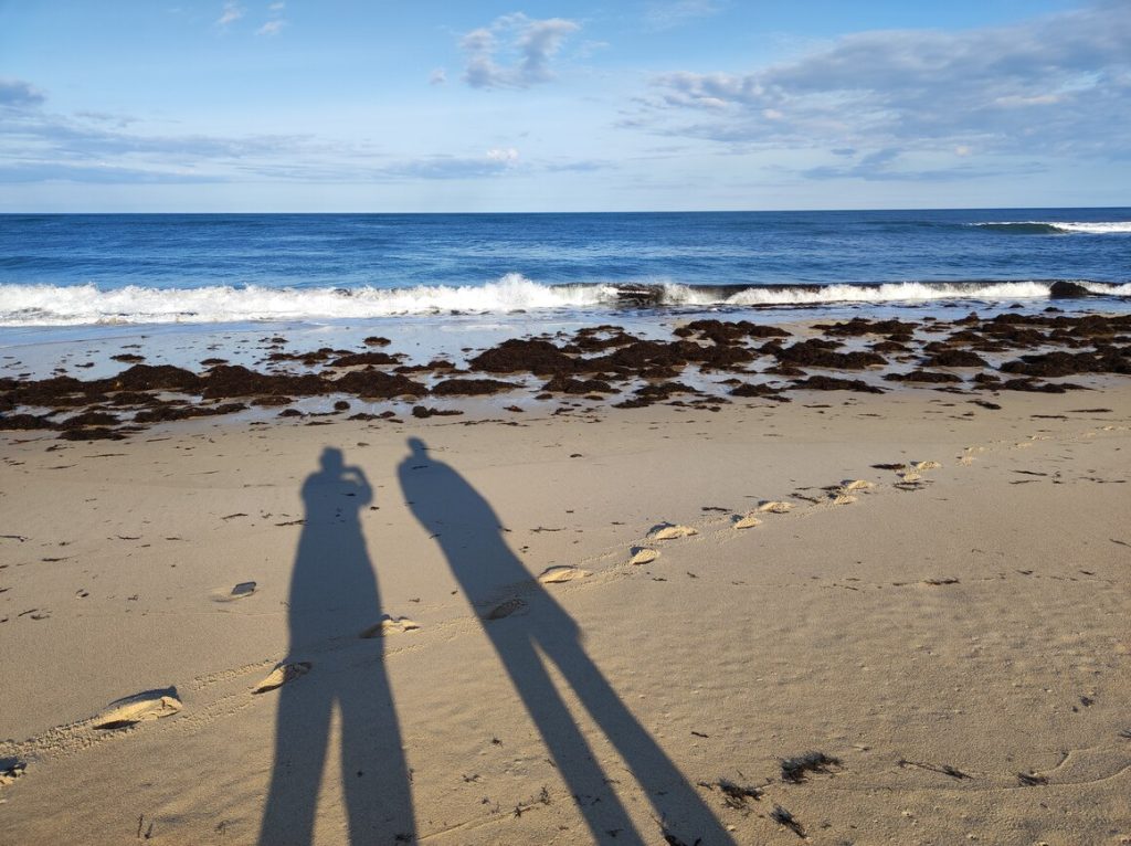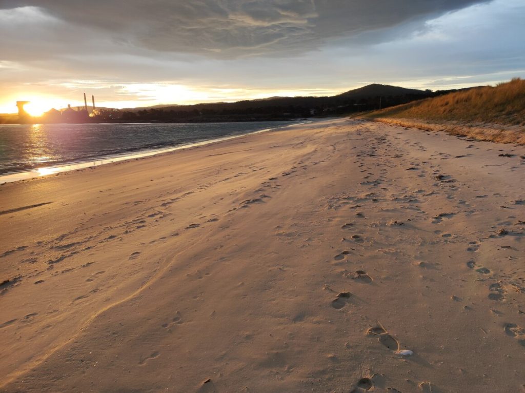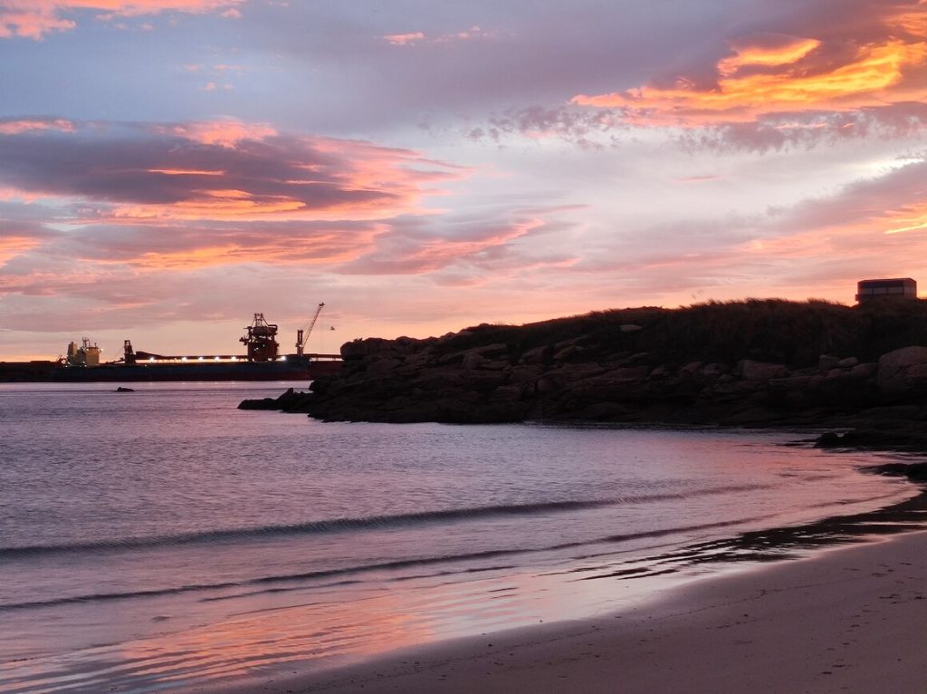 This really is a lovely beach – the sun is rising over the aluminium plant, so it has a bit of an industrial feel one way and to the other there’s another small fishing port. It looks a really nice place for a picnic as I imagine there’s a lot of activity to watch. We see the big ships going towards the aluminium plant and we know there are little tugs which we guess pull the ships around in the harbour – but I think we’d be able to see that from this beach, so we’ll definitely be keeping an eye open.