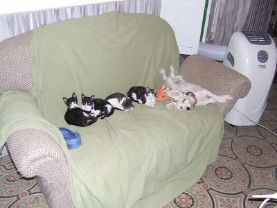 The picture is Henry, our new air conditioner, kitties and two of our Crocs.