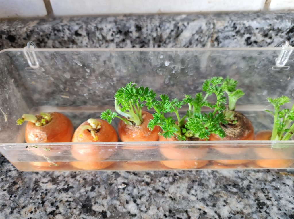 The lovebirds seem to quite like carrots so I’ve been popping a whole one into their cage which they then shred into tiny pieces. I’m not sure if they are treating it as food or as a toy! But I thought I might try growing the carrot tops and see how they get on with those. So far, they are sat on their perch ignoring them so it will probably be when I am not looking that they have a go at them.
