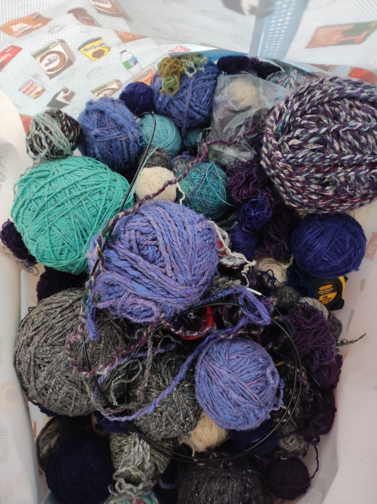 Because we didn’t really know what our plans were going to be and what sort of house we’d live (or even camp) in, I was looking for small portable craft projects to do. I had collected together old sweaters and things I have knitted in good quality yarn and slowly been unpicking them AND unwinding the wool to try to get it back to individual strands or as near as I can. Then respinning it into ‘new’ yarn.