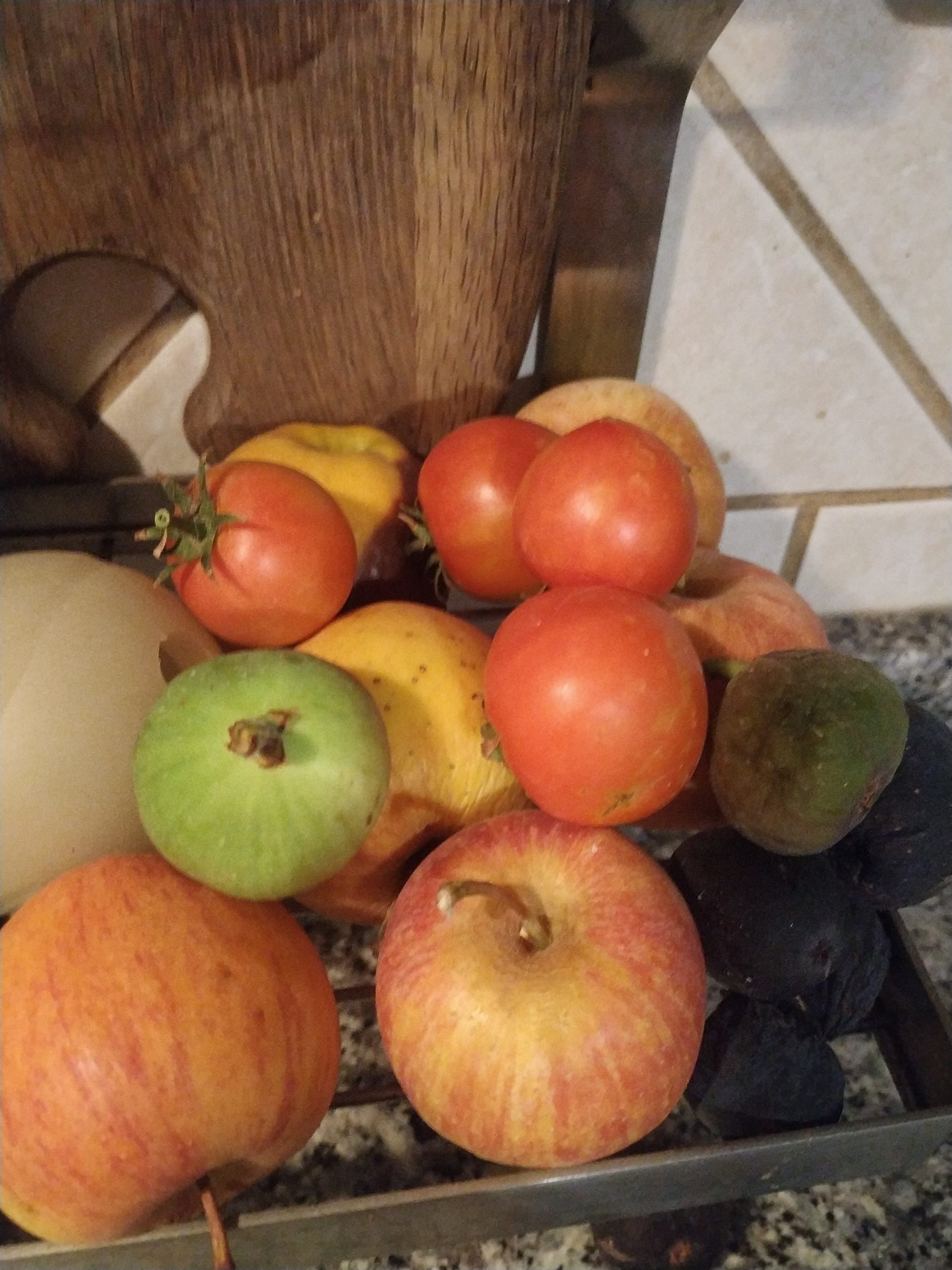 Our (very small) harvest. The fruit volume is actually inflated, looking at it, as Daisy’s luminous ball is in the pic! The success this year (besides apples that were actually bigger than cherries – and the two pomegranates that exploded) were figs. We have two different types – black and white, and both did well. We had enough to make a few meals with, which was nice.