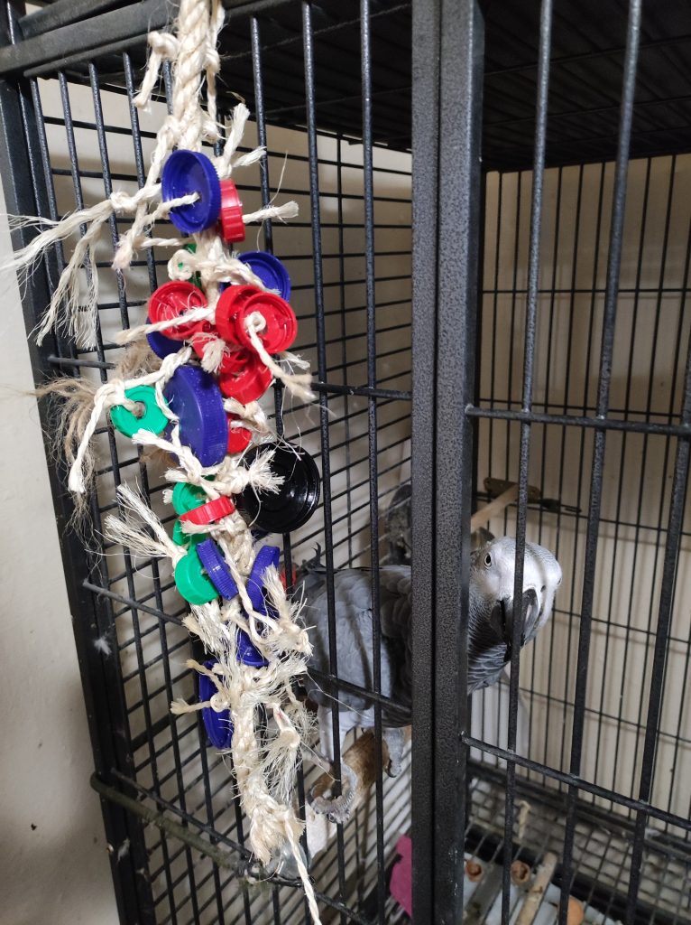 …. and Ludvig’s new toy! I hung it outside of his cage to give him an extra challenge to nibble through the knots.