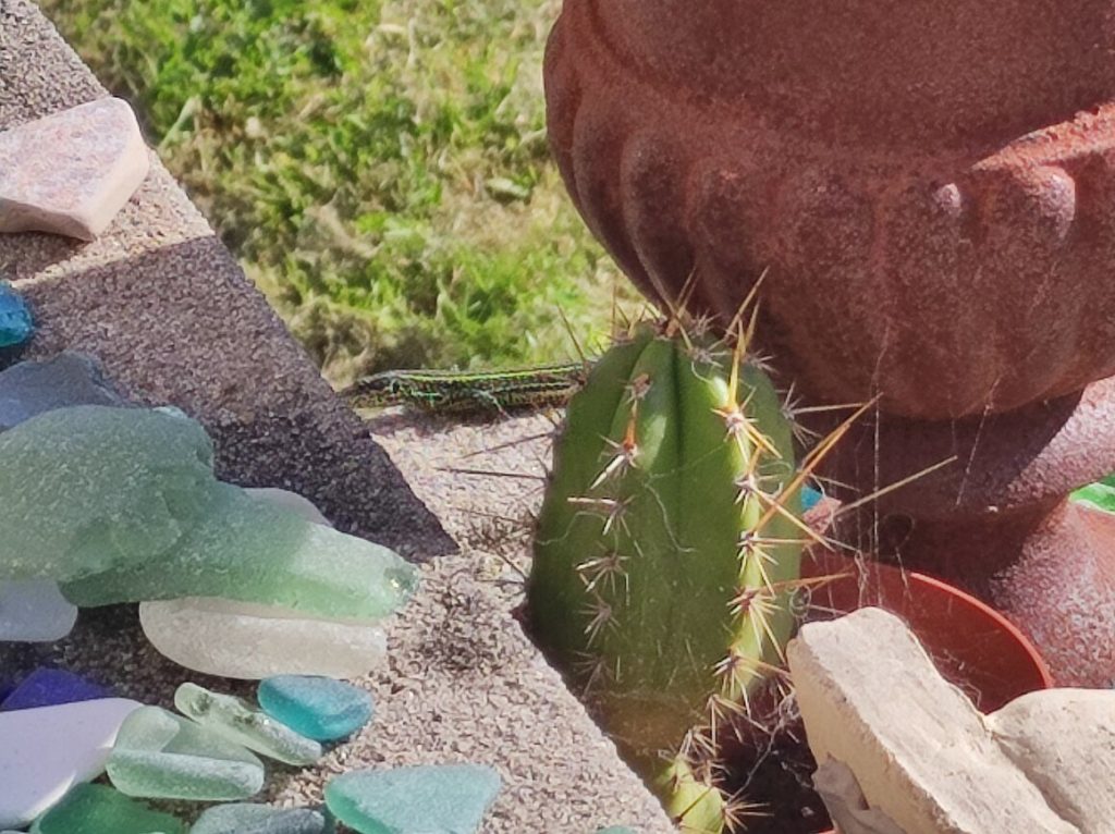 I don’t think we’ve seen a gecko yet, but we’ve got a few of these little wall lizards. Including this one which is hiding behind the pot, although you can’t see it in the photo, is amazingly green.
