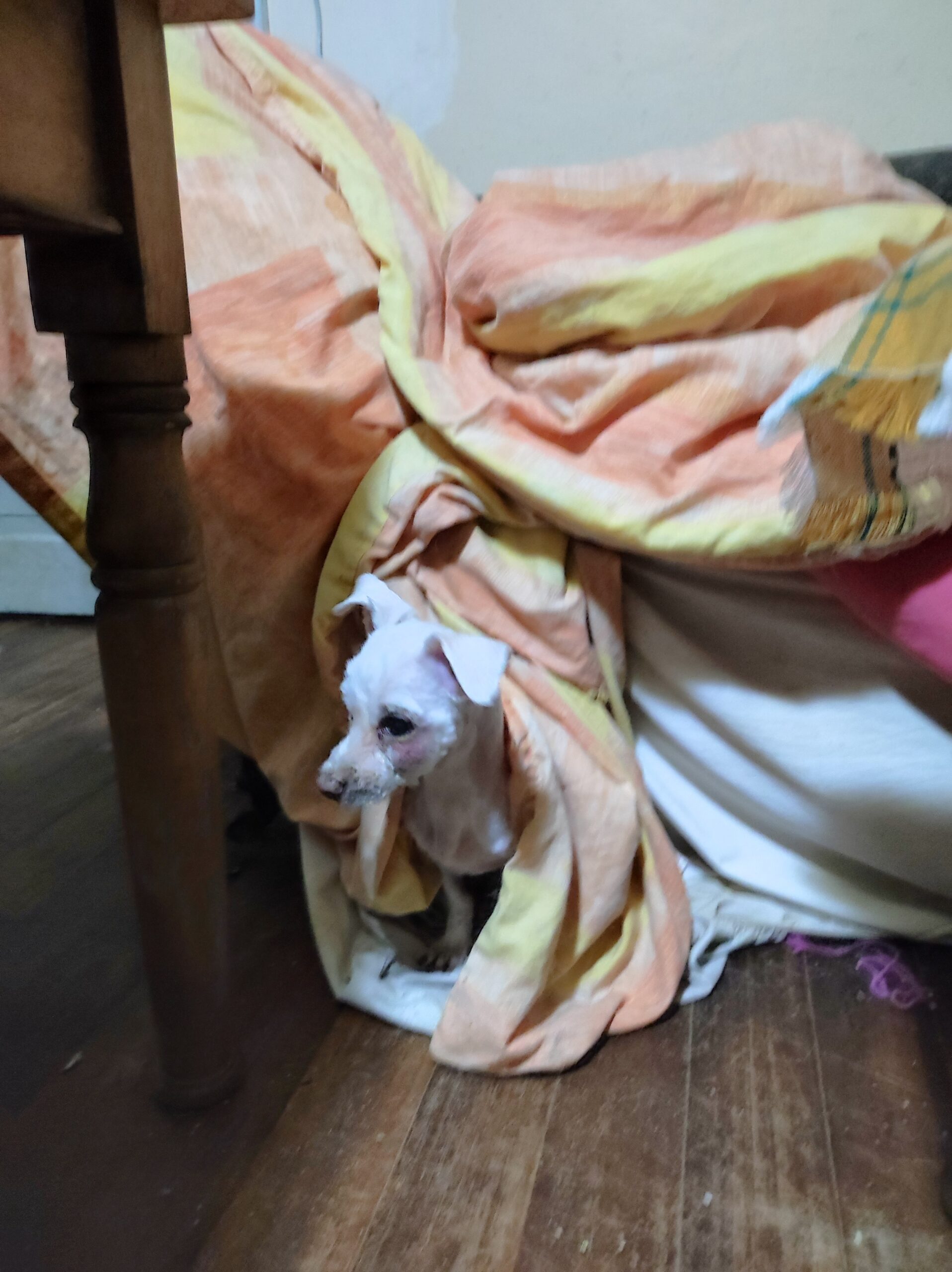 Horace went to the vet yesterday for a haircut. And here he is finding a bit of blanket which has fallen off the sofa. He can get on the sofa, well, he could, but he’s currently forgotten how.