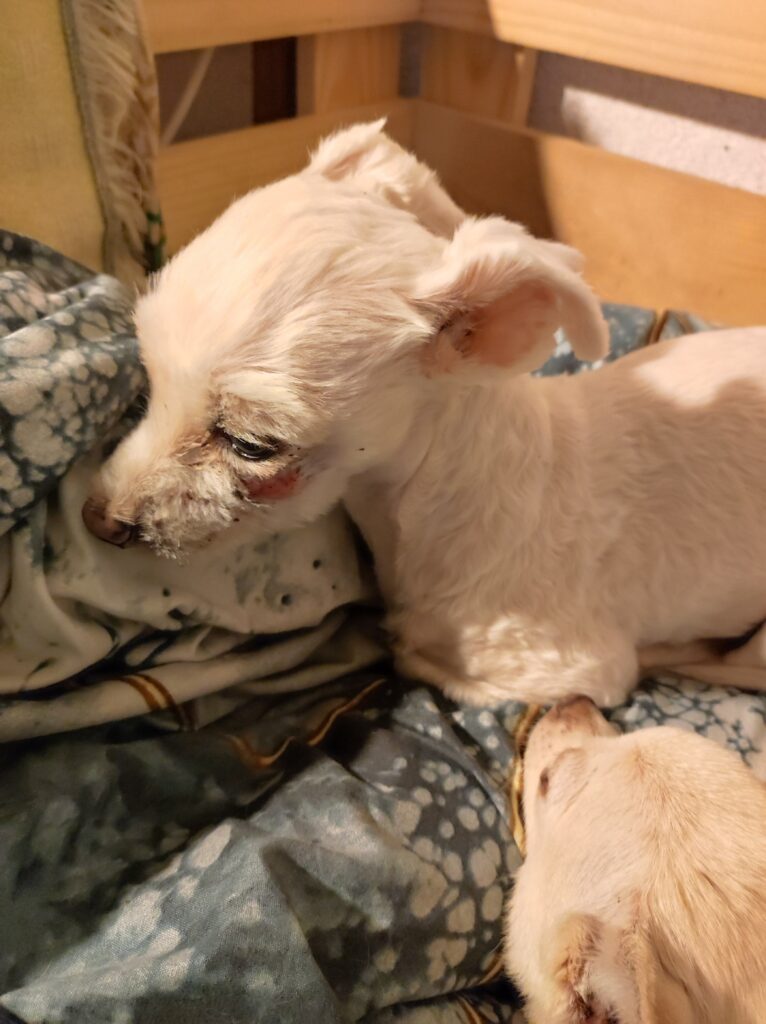 We took Horace back to the vet as a sort of emergency. The lump under his eye went from being a bit pink to becoming a very red and angry ball shaped lump and we didn’t know if that was normal and part of the process or something to be worried about. The vet said it shouldn’t look like that and as it was quite close to his eye she lanced the lump – which Horace took exception to and shook his head, covering everyone and everything in blood. Poor Ian took the brunt of it, with blood on his t-shirt. And the table that the vet was using looked like a butcher’s shop!