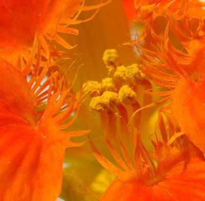 Ian bought me a macro lens for the camera for my birthday. This is a close up of an otherwise unprepossessing and past-its-best nasturtium flower.