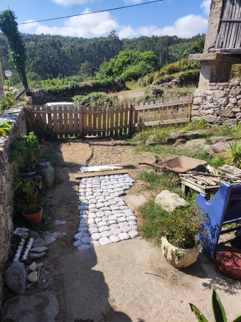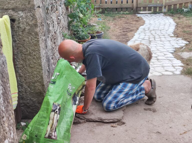 Ian’s been working on a path in the front garden. This is looking great! The ‘cobbles’ are made with cement wrapped in clingfilm. Ian puts them down and they sort of set into each other. When they are dry he…