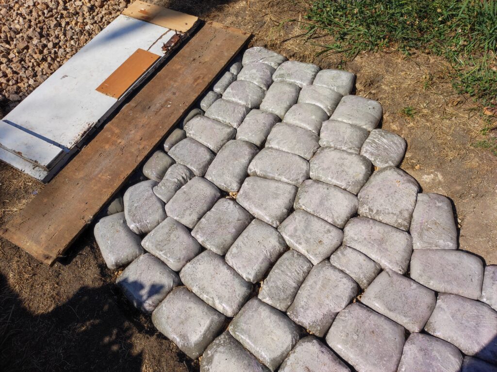 Ian’s been working on a path in the front garden. This is looking great! The ‘cobbles’ are made with cement wrapped in clingfilm. Ian puts them down and they sort of set into each other. When they are dry he will use a heat gun to melt the plastic off, then put mortar into the gaps.