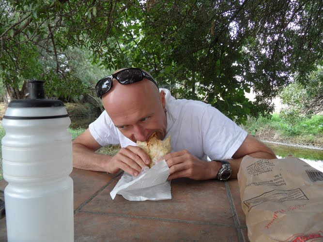 We decided to take our pasties out for a road test at lunch time. We went down to the village picnic spot which wasn’t far away. Pasties stood up to the journey well, but Ian cheated, putting his inside a rucksack. I stuck mine into a small bag on my bike, only to find that a/ it didn’t fit in and b/ was so big I kept knocking my knee against it. This resulted in a very slow ride to the picnic spot as I couldn’t bear the disappointment – or indeed the mess – of dropping the pasty onto the road.