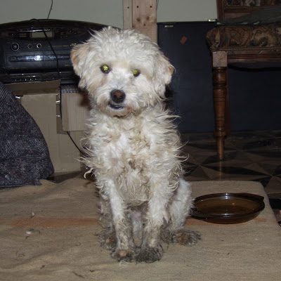 We get huge waggy tails too. He’s got a stumpy tail, it is still very matted so I can’t quite work out what is going on there, I think he must have lost part of it. You can see from the pic that he is very matted still at his front, I can’t get to that so I´ve just cut into the bigger matts so he is at least comfortable. He has been making a fuss about his injections so we are taking that as a good sign too.