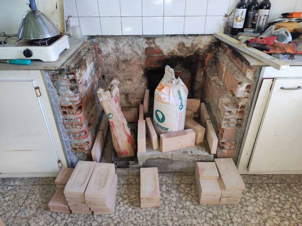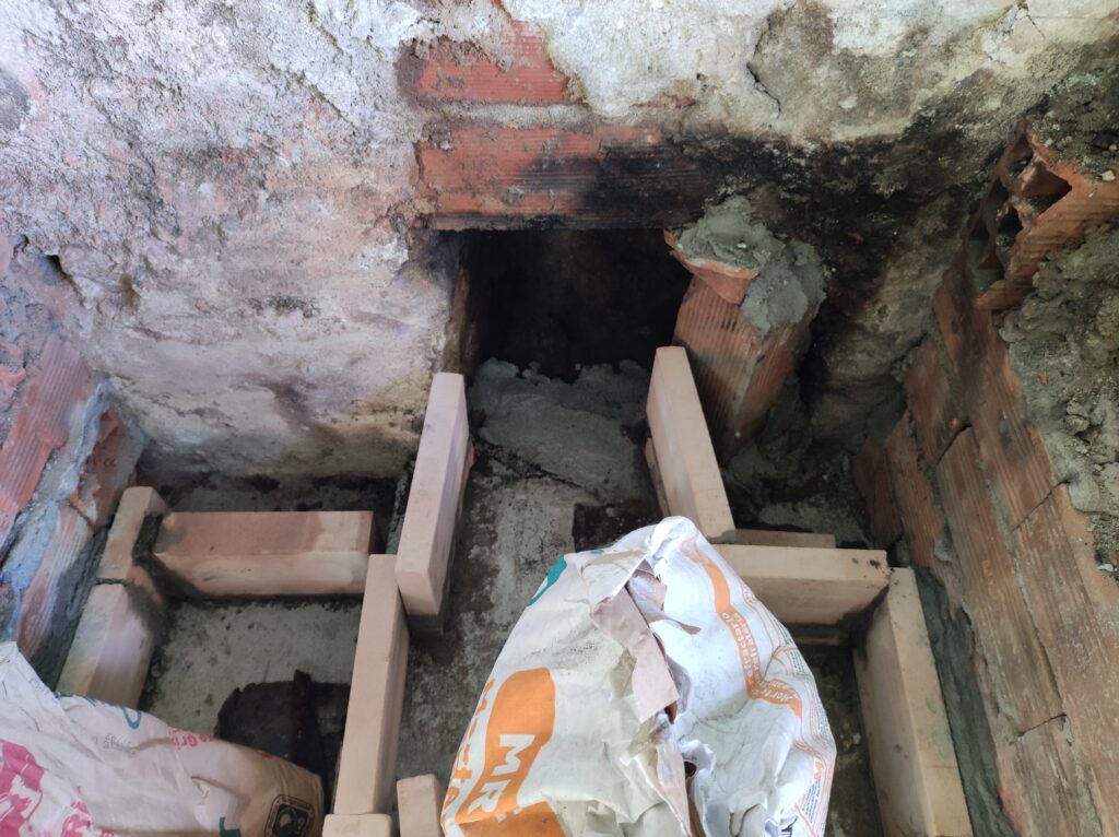 As we expected, there had been another stove there as the chimney opening had been made smaller. No doubt, as we thought, they took out a stove like the one we’re putting in and replacing it with the stove with the gas pipe running through the wood burning oven.