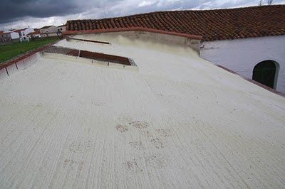 Immediately after Manuel and his space suited buddies left, having finished spraying the two roofs, I popped up to grab a couple of snaps. As I stood at the top of the ladder taking the shot across the roof of the house, the heavens opened. Kate and I had wondered if the colour of the sky affected the speed at which the sprayers worked, but fortunately they got the job done with 20 minutes to spare. I couldn’t find any leaks upstairs today, which is a relief with rain forecast for the next week.