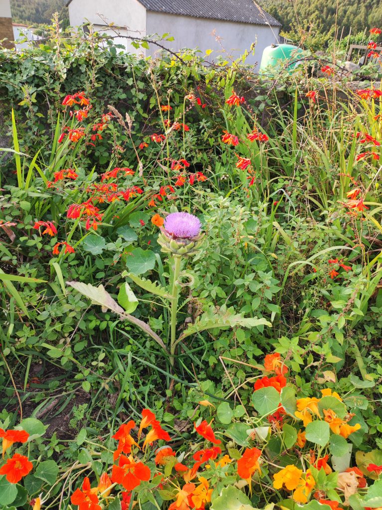 I’ve taken a few pics of the huerta which we can use as reference for next year at the end of the first four months. We’ve dug the potatoes up, and the first onions, we have some unidentified green leafy things, the calabaza peregino plants have formed a ‘hedge’ across the back of the garden, our artichoke has flowered (I think next year we can pick the er, buds?), we’ve got lots of cucumbers in the front garden and I’d defo plant them again there.