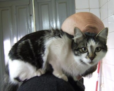 Tibs launches herself at Ian when ever she can. She started doing it by jumping off the fridge at him – but now jumps from the floor, from chairs – in fact from where ever she happens to be. She then quite happily sits there whilst Ian does what ever it is he was doing. Here, he is washing up!